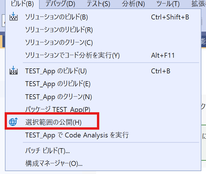 「ビルド」→「選択範囲の公開」をクリック