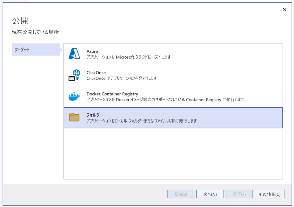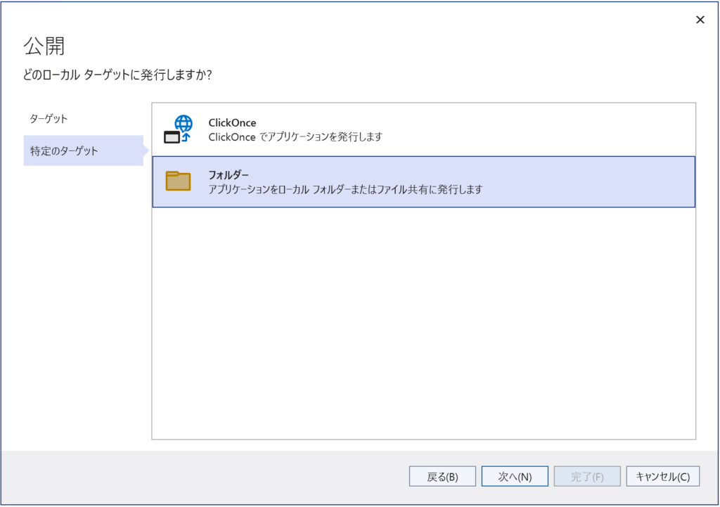 「フォルダー」を選択した状態で、「次へ」をクリック。